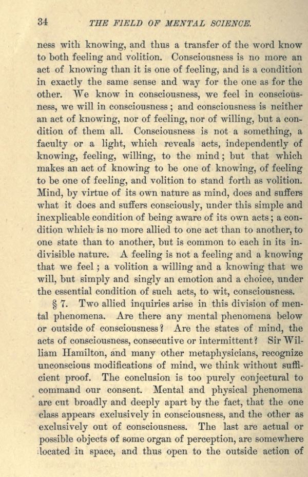 7. Two allied inquiries arise in this division of mental phenomena. Are there any mental phenomena below or outside of consciousness? Are the states of mind, the acts of consciousness, consecutive or intermittent? Sir William Hamilton, and many other metaphysicians, recognize unconscious modifications of mind, we think without sufficient proof. The conclusion is too purely conjectural to command our consent. Mental and physical phenomena are cut broadly and deeply apart by the fact, that the one class appears exclusively in consciousness, and the other as exclusively out of consciousness. The last are actual or possible objects of some organ of perception, are somewhere located in space, and thus open to the outside action of