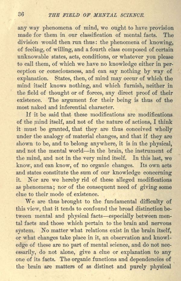 any way phenomena of mind, we ought to have provision made for them in our classification of mental facts. The division would then run thus: the phenomena of knowing, of feeling, of willing, and a fourth class composed of certain unknowable states, acts, conditions, or whatever you please to call them, of which we have no knowledge either in perception or consciousness, and can say nothing by way of explanation. States, then, of mind may occur of which the mind itself knows nothing, and which furnish, neither in the field of thought or of forces, any direct proof of their existence. The argument for their being is thus of the most naked and inferential character.