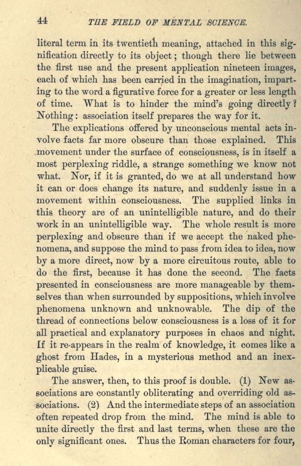 The explications offered by unconscious mental acts involve facts far more obscure than those explained. This movement under the surface of consciousness, is in itself a most perplexing riddle, a strange something we know not what. Nor, if it is granted, do we at all understand how it can or does change its nature, and suddenly issue in a movement within consciousness. The supplied links in this theory are of an unintelligible nature, and do their work in an unintelligible way. The whole result is more perplexing and obscure than if we accept the naked phenomena, and suppose the mind to pass from idea to idea, now by a more direct, now by a more circuitous route, able to do the first, because it has done the second. The facts presented in consciousness are more manageable by themselves than when surrounded by suppositions, which involve phenomena unknown and unknowable. The dip of the thread of connections below consciousness is a loss of it for all practical and explanatory purposes in chaos and night. If it re-appears in the realm of knowledge, it comes like a ghost from Hades, in a mysterious method and an inexplicable guise.
