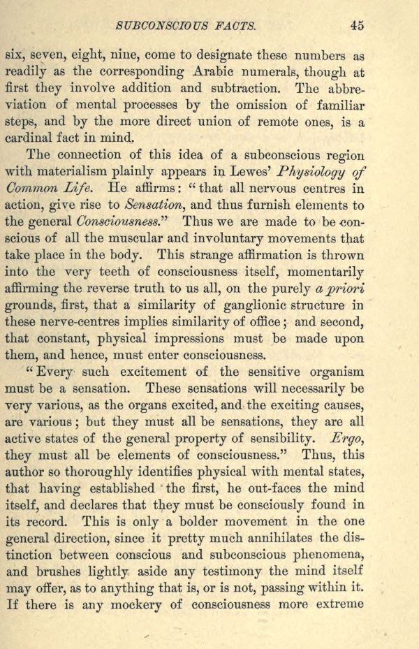 The connection of this idea of a subconscious region with materialism plainly appears in Lewes' Physiology of Common Life. He affirms: "that all nervous centres in action, give rise to Sensation, and thus furnish elements to the general Consciousness" Thus we are made to be -conscious of all the muscular and involuntary movements that take place in the body. This strange affirmation is thrown into the very teeth of consciousness itself, momentarily affirming the reverse truth to us all, on the purely a priori grounds, first, that a similarity of ganglionic structure in these nerve-centres implies similarity of office; and second, that constant, physical impressions must be made upon them, and hence, must enter consciousness.