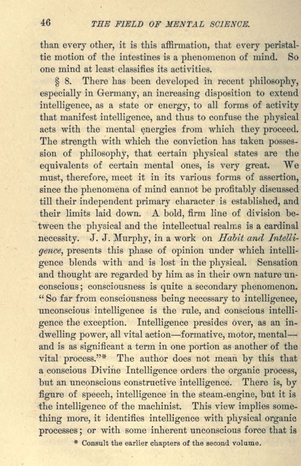 8. There has been developed in recent philosophy, especially in Germany, an increasing disposition to extend intelligence, as a state or energy, to all forms of activity that manifest intelligence, and thus to confuse the physical acts with the mental energies from which they proceed. The strength with which the conviction has taken possession of philosophy, that certain physical states are the equivalents of certain mental ones, is very great. We must, therefore, meet it in its various forms of assertion, since the phenomena of mind cannot be profitably discussed till their independent primary character is established, and their limits laid down. A bold, firm line of division between the physical and the intellectual realms is a cardinal necessity. J. J. Murphy, in a work on Habit and Intelligence, presents this phase of opinion under which intelligence blends with and is lost in the physical. Sensation and thought are regarded by him as in their own nature unconscious; consciousness is quite a secondary phenomenon. "So far from consciousness being necessary to intelligence, unconscious intelligence is the rule, and conscious intelligence the exception. Intelligence presides over, as an indwelling power, all vital action formative, motor, mental and is as significant a term in one portion as another of the vital process."* The author does not mean by this that a conscious Divine Intelligence orders the organic process, but an unconscious constructive intelligence. There is, by figure of speech, intelligence in the steam-engine, but it is the intelligence of the machinist. This view implies something more, it identifies intelligence with physical organic processes; or with some inherent unconscious force that is