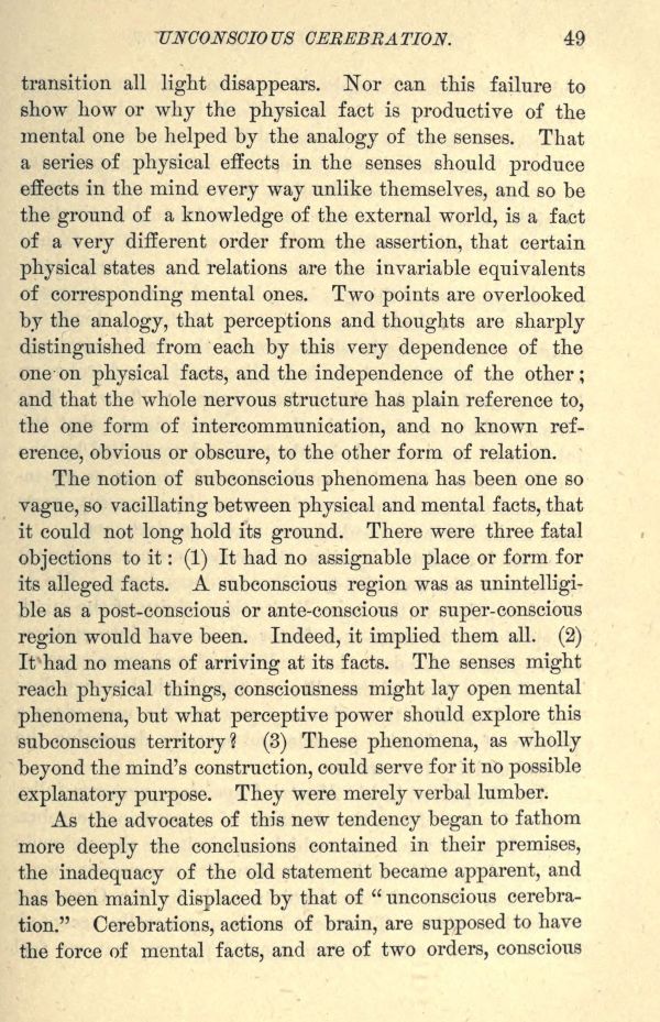 The notion of subconscious phenomena has been one so vague, so vacillating between physical and mental facts, that it could not long hold its ground. There were three fatal objections to it: (1) It had no assignable place or form for its alleged facts. A subconscious region was as unintelligible as a post-conscious or ante-conscious or super-conscious region would have been. Indeed, it implied them all. (2) It had no means of arriving at its facts. The senses might reach physical things, consciousness might lay open mental phenomena, but what perceptive power should explore this subconscious territory? (3) These phenomena, as wholly beyond the mind's construction, could serve for it no possible explanatory purpose. They were merely verbal lumber.
