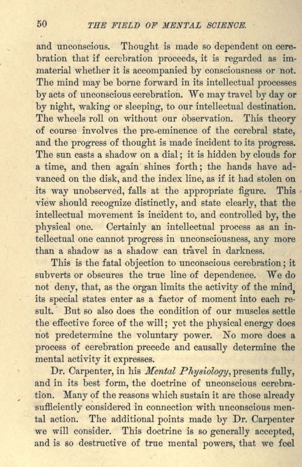 Dr. Carpenter, in his Mental Physiology, presents fully, and in its best form, the doctrine of unconscious cerebration. Many of the reasons which sustain it are those already sufficiently considered in connection with unconscious mental action. The additional points made by Dr. Carpenter we will consider. This doctrine is so generally accepted, and is so destructive of true mental powers, that we feel