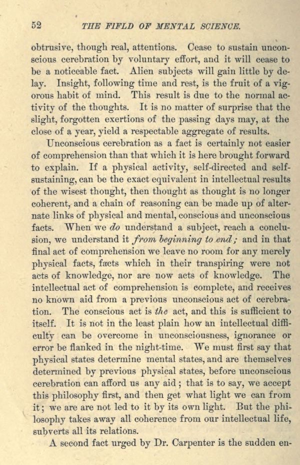 Unconscious cerebration as a fact is certainly not easier of comprehension than that which it is here brought forward to explain. If a physical activity, self-directed and self sustaining, can be the exact equivalent in intellectual results of the wisest thought, then thought as thought is no longer coherent, and a chain of reasoning can be made up of alternate links of physical and mental, conscious and unconscious facts. When we do understand a subject, reach a conclusion, we understand it from beginning to end; and in that final act of comprehension we leave no room for any merely physical facts, facts which in their transpiring were not acts of knowledge, nor are now acts of knowledge. The intellectual act of comprehension is complete, and receives no known aid from a previous unconscious act of cerebration. The conscious act is the act, and this is sufficient to itself. It is not in the least plain how an intellectual difficulty can be overcome in unconsciousness, ignorance or error be flanked in the night-time. We must first say that physical states determine mental states, and are themselves determined by previous physical states, before unconscious cerebration can afford us any aid; that is to say, we accept this philosophy first, and then get what light we can from it; we are are not led to it by its own light. But the philosophy takes away all coherence from our intellectual life, subverts all its relations.