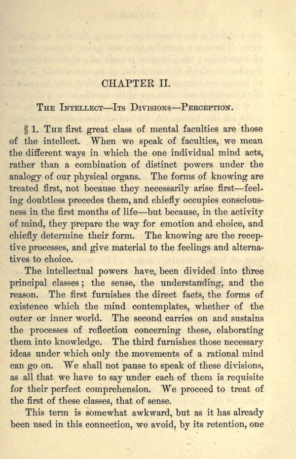 The intellectual powers have, been divided into three principal classes; the sense, the understanding, and the reason. The first furnishes the direct facts, the forms of existence which the mind contemplates, whether of the outer or inner world. The second carries on and sustains the processes of reflection concerning these, elaborating them into knowledge. The third furnishes those necessary ideas under which only the movements of a rational mind can go on. "We shall not pause to speak of these divisions, as all that we have to say under each of them is requisite for their perfect comprehension. We proceed to treat of the first of these classes, that of sense.