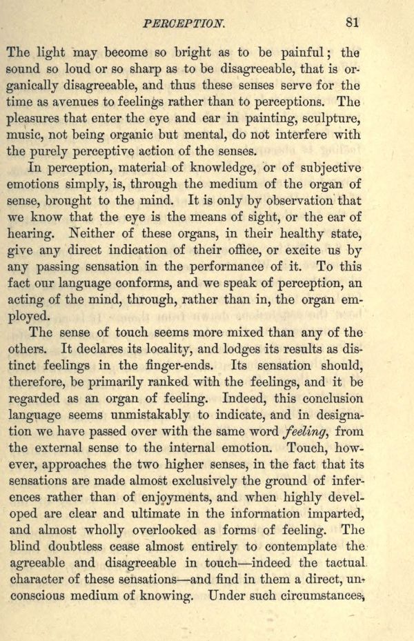 The sense of touch seems more mixed than any of the others. It declares its locality, and lodges its results as distinct feelings in the finger-ends. Its sensation should, therefore, be primarily ranked with the feelings, and it be regarded as an organ of feeling. Indeed, this conclusion language seems unmistakably to indicate, and in designation we have passed over with the same word feeling, from the external sense to the internal emotion. Touch, however, approaches the two higher senses, in the fact that its sensations are made almost exclusively the ground of inferences rather than of enjoyments, and when highly developed are clear and ultimate in the information imparted, and almost wholly overlooked as forms of feeling. The blind doubtless cease almost entirely to contemplate the agreeable and disagreeable in touch indeed the tactual, character of these sensations and find in them a direct, unconscious medium of knowing. Under such circumstances,