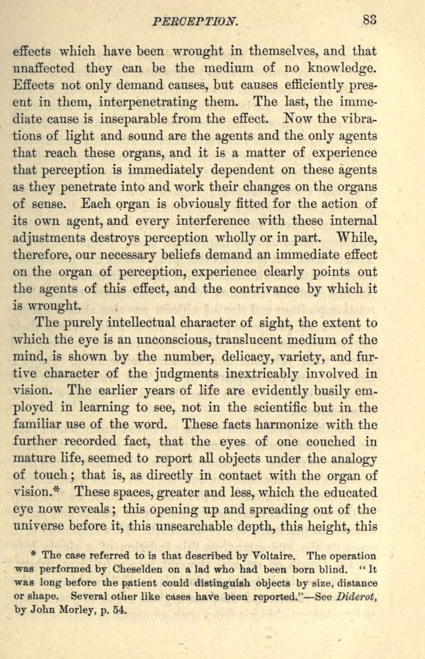 * The case referred to is that described by Voltaire. The operation was performed by Cheselden on a lad who had been born blind. " It was long before the patient could distinguish objects by size, distance or shape. Several other like cases have been reported." See Diderot, by John Morley, p. 54.