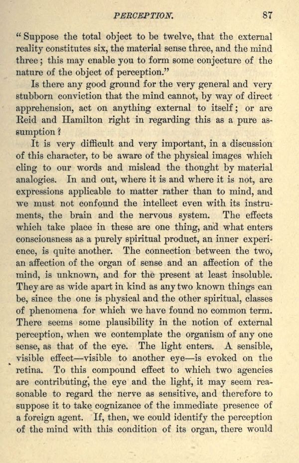 It is very difficult and very important, in a discussion of this character, to be aware of the physical images which cling to our words and mislead the thought by material analogies. In and out, where it is and where it is not, are expressions applicable to matter rather than to mind, and we must not confound the intellect even with its instruments, the brain and the nervous system. The effects which take place in these are one thing, and what enters consciousness as a purely spiritual product, an inner experience, is quite another. The connection between the two, an affection of the organ of sense and an affection of the mind, is unknown, and for the present at least insoluble. They are as wide apart in kind as any two known things can be, since the one is physical and the other spiritual, classes of phenomena for which we have found no common term. There seems some plausibility in the notion of external perception, when we contemplate the organism of any one sense, as that of the eye. The light enters. A sensible, visible effect visible to another eye is evoked on the retina. To this compound effect to which two agencies are contributing, the eye and the light, it may seem reasonable to regard the nerve as sensitive, and therefore to suppose it to take cognizance of the immediate presence of a foreign agent. If, then, we could identify the perception of the mind with this condition of its organ, there would