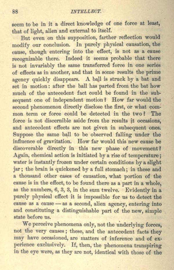 But even on this supposition, farther reflection would modify our conclusion. In purely physical causation, the cause, though entering into the effect, is not as a cause recognizable there. Indeed it seems probable that there is not invariably the same transferred force in one series of effects as in another, and that in some results the prime agency quickly disappears. A ball is struck by a bat and get in motion: after the ball has parted from the bat how much of the antecedent fact could be found in the subsequent one of independent motion? How far would the second phenomenon directly disclose the first, or what common term or force could be detected in the two? The force is not discernible aside from the results it occasions, and antecedent effects are not given in subsequent ones. Suppose the same ball to be observed falling under the influence of gravitation. How far would this new cause be discoverable directly in this new phase of movement? Again, chemical action is initiated by a rise of temperature; water is instantly frozen under certain conditions by a slight jar; the brain is quickened by a full stomach; in these and a thousand other cases of causation, what portion of the cause is in the effect, to be found there as a part in a whole, as the numbers, 6, 3, 3, in the sum twelve. Evidently in a purely physical effect it is impossible for us to detect the cause as a cause as a second, alien agency, entering into and constituting a distinguishable part of the new, simple state before us.