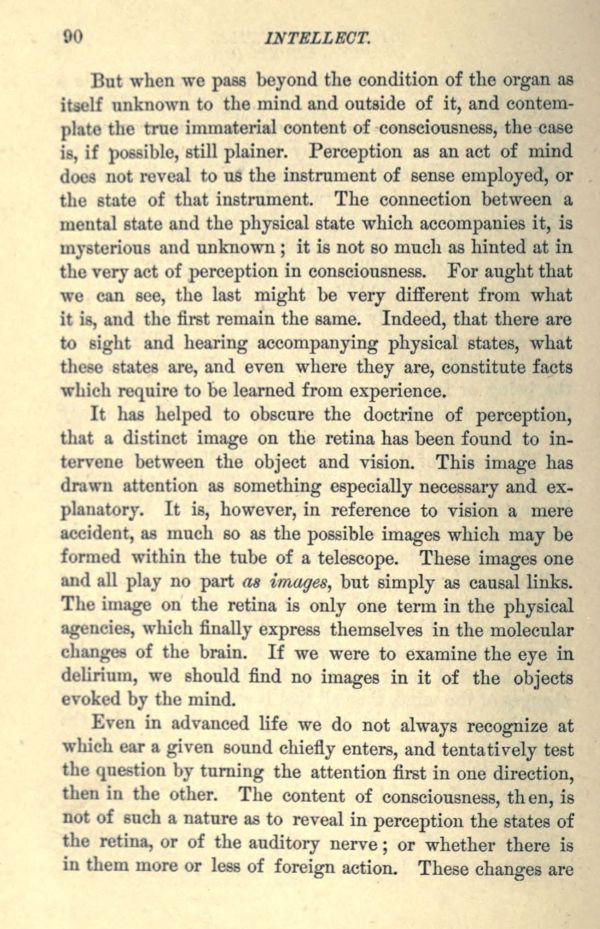 But when we pass beyond the condition of the organ as itself unknown to the mind and outside of it, and contemplate the true immaterial content of consciousness, the case is, if possible, still plainer. Perception as an act of mind does not reveal to us the instrument of sense employed, or the state of that instrument. The connection between a mental state and the physical state which accompanies it, is mysterious and unknown; it is not so much as hinted at in the very act of perception in consciousness. For aught that we can see, the last might be very different from what it is, and the first remain the same. Indeed, that there are to sight and hearing accompanying physical states, what these states are, and even where they are, constitute facts which require to be learned from experience.