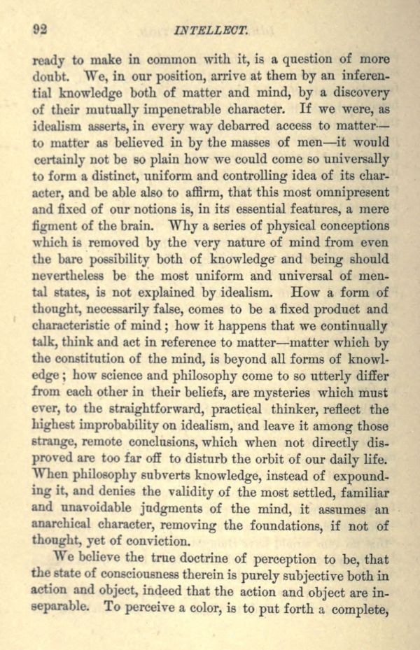ready to make in common with it, is a question of more doubt. We, in our position, arrive at them by an inferential knowledge both of matter and mind, by a discovery of their mutually impenetrable character. If we were, as idealism asserts, in every way debarred access to matter --- to matter as believed in by the masses of men it would certainly not be so plain how we could come so universally to form a distinct, uniform and controlling idea of its character, and be able also to affirm, that this most omnipresent and fixed of our notions is, in its essential features, a mere figment of the brain. Why a series of physical conceptions which is removed by the very nature of mind from even the bare possibility both of knowledge and being should nevertheless be the most uniform and universal of mental states, is not explained by idealism. How a form of thought, necessarily false, comes to be a fixed product and characteristic of mind; how it happens that we continually talk, think and act in reference to matter matter which by the constitution of the mind, is beyond all forms of knowledge; how science and philosophy come to so utterly differ from each other in their beliefs, are mysteries which must ever, to the straightforward, practical thinker, reflect the highest improbability on idealism, and leave it among those strange, remote conclusions, which when not directly disproved are too far off to disturb the orbit of our daily life. When philosophy subverts knowledge, instead of expounding it, and denies the validity of the most settled, familiar and unavoidable judgments of the mind, it assumes an anarchical character, removing the foundations, if not of thought, yet of conviction.