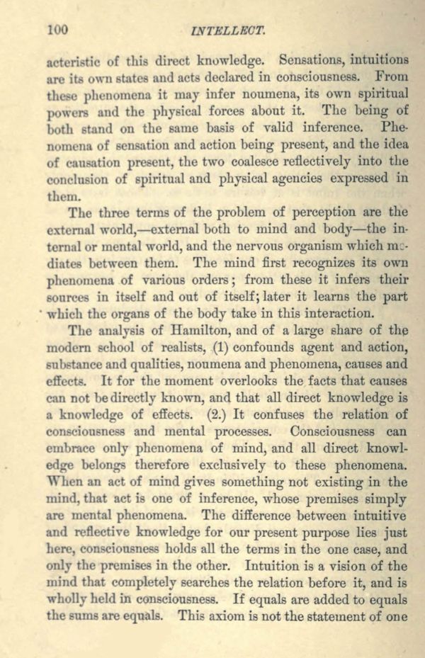 The analysis of Hamilton, and of a large share of the modern school of realists, (1) confounds agent and action, substance and qualities, noumena and phenomena, causes and effects. It for the moment overlooks the facts that causes can not be directly known, and that all direct knowledge is a knowledge of effects. (2.) It confuses the relation of consciousness and mental processes. Consciousness can embrace only phenomena of mind, and all direct knowledge belongs therefore exclusively to these phenomena. When an act of mind gives something not existing in the mind, that act is one of inference, whose premises simply are mental phenomena. The difference between intuitive and reflective knowledge for our present purpose lies just here, consciousness holds all the terms in the one case, and only the premises in the other. Intuition is a vision of the mind that completely searches the relation before it, and is wholly held in consciousness. If equals are added to equals the sums are equals. This axiom is not the statement of one