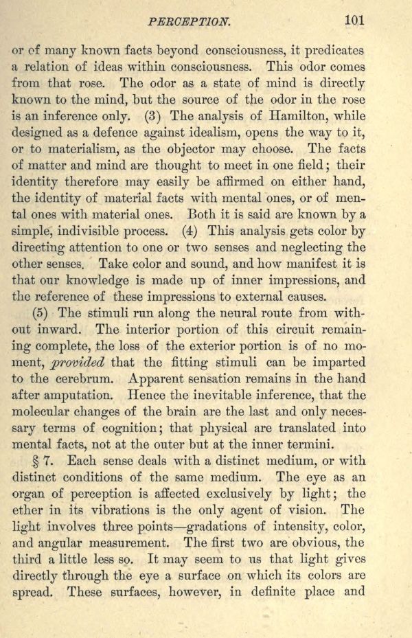 or of many known facts beyond consciousness, it predicates a relation of ideas within consciousness. This odor comes from that rose. The odor as a state of mind is directly known to the mind, but the source of the odor in the rose is an inference only. (3) The analysis of Hamilton, while designed as a defence against idealism, opens the way to it, or to materialism, as the objector may choose. The facts of matter and mind are thought to meet in one field; their identity therefore may easily be affirmed on either hand, the identity of material facts with mental ones, or of mental ones with material ones. Both it is said are known by a simple, indivisible process. (4) This analysis gets color by directing attention to one or two senses and neglecting the other senses. Take color and sound, and how manifest it is that our knowledge is made up of inner impressions, and the reference of these impressions to external causes.