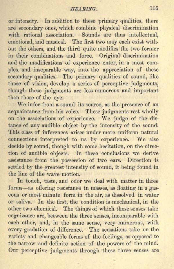 or intensity. In addition to these primary qualities, there are secondary ones, which combine physical discrimination with rational association. Sounds are thus intellectual, emotional, arid musical. The first two may each exist without the others, and the third quite modifies the two former in their combinations and force. Original discrimination and the modifications of experience enter, in a most complex and inseparable way, into the appreciation of these secondary qualities. The primary qualities of sound, like those of vision, develop a series of perceptive judgments, though these judgments are less numerous and important than those of the eye.