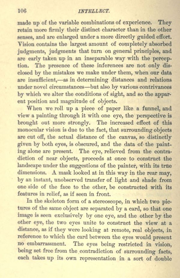 In the skeleton form of a stereoscope, in which two pictures of the same object are separated by a card, so that one image is seen exclusively by one eye, and the other by the other eye, the two eyes unite to construct the view at a distance, as if they were looking at remote, real objects, in reference to which the card between the eyes would present no embarrassment. The eyes being restricted in vision, being set free from the contradiction of surrounding facts, each takes up its own representation in a sort of double