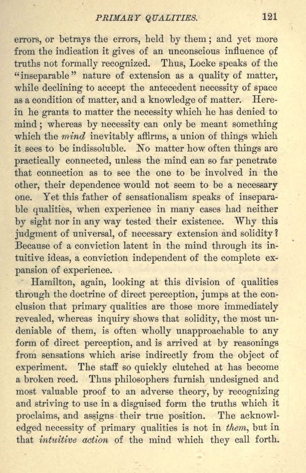 Hamilton, again, looking at this division of qualities through the doctrine of direct perception, jumps at the conclusion that primary qualities are those more immediately revealed, whereas inquiry shows that solidity, the most undeniable of them, is often wholly unapproachable to any form of direct perception, and is arrived at by reasonings from sensations which arise indirectly from the object of experiment. The staff so quickly clutched at has become a broken reed. Thus philosophers furnish undesigned and most valuable proof to an adverse theory, by recognizing and striving to use in a disguised form the truths which it proclaims, and assigns their true position. The acknowledged necessity of primary qualities is not in them, but in that intuitive action of the mind which they call forth.