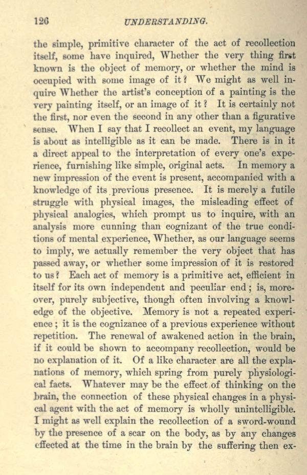 the simple, primitive character of the act of recollection itself, some have inquired, Whether the very thing first known is the object of memory, or whether the mind is occupied with some image of it? We might as well inquire Whether the artist's conception of a painting is the very painting itself, or an image of it? It is certainly not the first, nor even the second in any other than a figurative sense. When I say that I recollect an event, my language is about as intelligible as it can be made. There is in it a direct appeal to the interpretation of every one's experience, furnishing like simple, original acts. In memory a new impression of the event is present, accompanied with a knowledge of its previous presence. It is merely a futile struggle with physical images, the misleading effect of physical analogies, which prompt us to inquire, with an analysis more cunning than cognizant of the true conditions of mental experience, Whether, as our language seems to imply, we actually remember the very object that has passed away, or whether some impression of it is restored to us? Each act of memory is a primitive act, efficient in itself for its own independent and peculiar end; is, moreover, purely subjective, though often involving a knowledge of the objective. Memory is not a repeated experience; it is the cognizance of a previous experience without repetition. The renewal of awakened action in the brain, if it could be shown to accompany recollection, would be no explanation of it. Of a like character are all the explanations of memory, which spring from purely physiological facts. Whatever may be the effect of thinking on the brain, the connection of these physical changes in a physical agent with the act of memory is wholly unintelligible. I might as well explain the recollection of a sword-wound by the presence of a scar on the body, as by any changes effected at the time in the brain by the suffering then experienced.