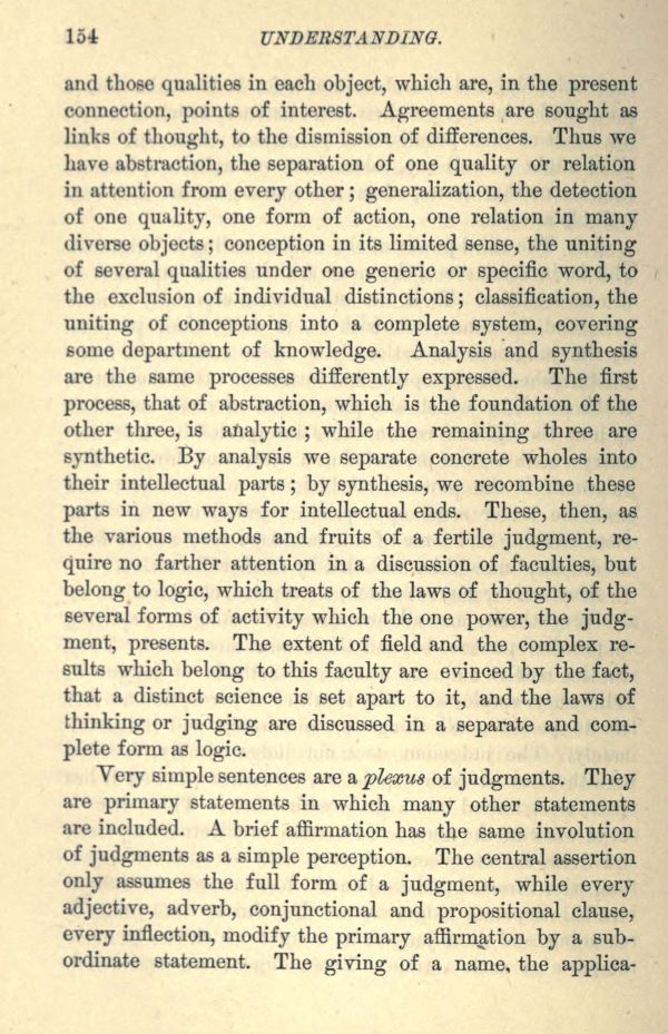 and those qualities in each object, which are, in the present connection, points of interest. Agreements are sought as links of thought, to the dismission of differences. Thus we have abstraction, the separation of one quality or relation in attention from every other; generalization, the detection of one quality, one form of action, one relation in many diverse objects; conception in its limited sense, the uniting of several qualities under one generic or specific word, to the exclusion of individual distinctions; classification, the uniting of conceptions into a complete system, covering some department of knowledge. Analysis and synthesis are the same processes differently expressed. The first process, that of abstraction, which is the foundation of the other three, is analytic; while the remaining three are synthetic. By analysis we separate concrete wholes into their intellectual parts; by synthesis, we recombine these parts in new ways for intellectual ends. These, then, as the various methods and fruits of a fertile judgment, require no farther attention in a discussion of faculties, but belong to logic, which treats of the laws of thought, of the several forms of activity which the one power, the judgment, presents. The extent of field and the complex results which belong to this faculty are evinced by the fact, that a distinct science is set apart to it, and the laws of thinking or judging are discussed in a separate and complete form as logic.
