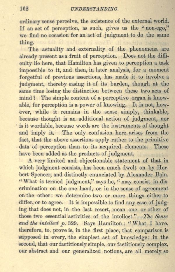 A very limited and objectionable statement of that in which judgment consists, has been much dwelt on by Herbert Spencer, and distinctly enunciated by Alexander Bain. "What is termed judgment," says he, "may consist in discrimination on the one hand, or in the sense of agreement on the other: we determine two or more things either to differ, or to agree. It is impossible to find any case of judging that does not, in the last resort, mean one or other of those two essential activities of the intellect." The Sense and the intellect p. 329. Says Hamilton: " What I have, therefore, to , prove is, in the first place, that comparison is supposed in every, the simplest act of knowledge: in the second, that our factitiously simple, our factitiously complex, our abstract and our generalized notions, are all merely so