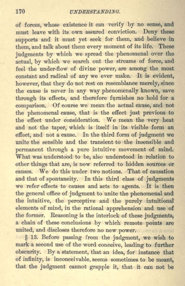 13. Before passing from the judgment, we wish to mark a second use of the word conceive, leading to further obscurity. By a statement, that an idea, for instance that of infinity, is inconceivable, seems sometimes to be meant, that the judgment cannot grapple it, that it can not be