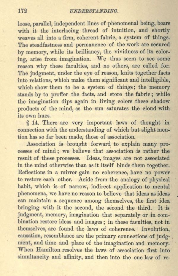 Association is brought forward to explain many processes of mind; we believe that association is rather the result of these processes. Ideas, images are not associated in the mind otherwise than as it itself binds them together. Reflections in a mirror gain no coherence, have no power to restore each other. Aside from the analogy of physical habit, which is of narrow, indirect application to mental phenomena, we have no reason to believe that ideas as ideas can maintain a sequence among themselves, the first idea bringing with it the second, the second the third. It is judgment, memory, imagination that separately or in combination restore ideas and images; in these faculties, not in themselves, are found the laws of coherence. Involution, causation, resemblance are the primary connections of judgment, and time and place of the imagination and memory. "When Hamilton resolves the laws of association first into simultaneity and affinity, and then into the one law of redintegration