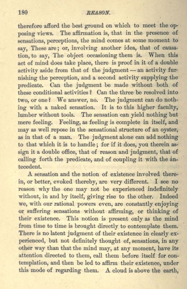 therefore afford the best ground on which to meet the opposing views. The affirmation is, that in the presence of sensations, perceptions, the mind comes at some moment to say, These are; or, involving another idea, that of causation, to say, The object occasioning them is. When this act of mind does take place, there is proof in it of a double activity aside from that of the judgment an activity furnishing the perception, and a second activity supplying the predicate. Can the judgment be made without both of these conditional activities? Can the three be resolved into two, or one? We answer, no. The judgment can do nothing with a naked sensation. It is to this higher faculty, lumber without tools. The sensation can yield nothing but mere feeling. Feeling, as feeling is complete in itself, and may as well repose in the sensational structure of an oyster, as in that of a man. The judgment alone can add nothing to that which it is to handle; for if it does, you therein assign it a double office, that of reason and judgment, that of calling forth the predicate, and of coupling it with the antecedent.
