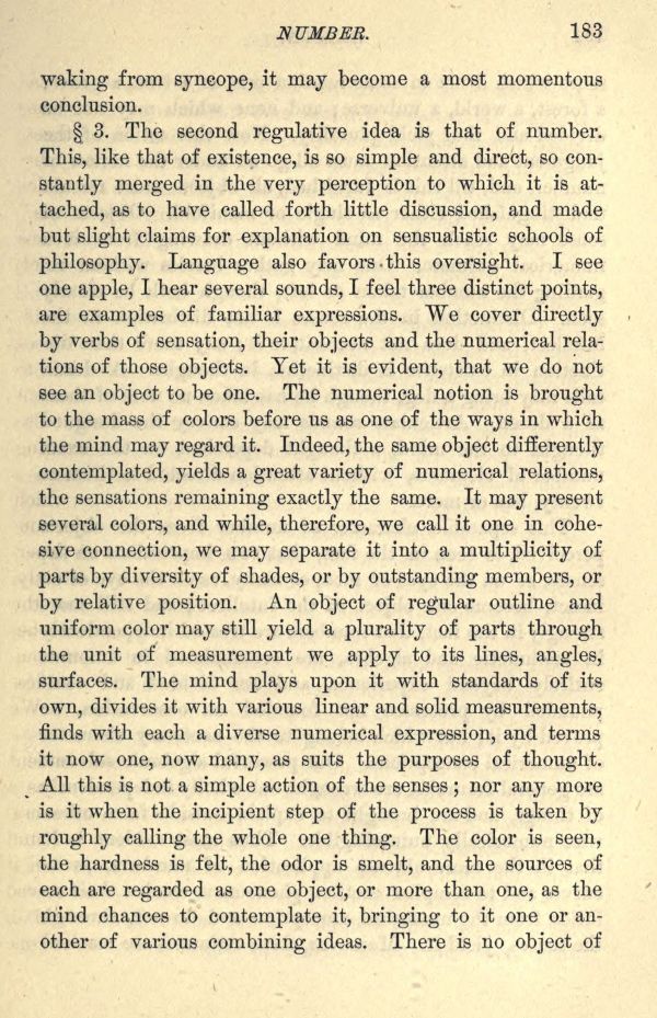 3. The second regulative idea is that of number. This, like that of existence, is so simple and direct, so constantly merged in the very perception to which it is attached, as to have called forth little discussion, and made but slight claims for explanation on sensualistic schools of philosophy. Language also favors. this oversight. I see one apple, I hear several sounds, I feel three distinct points, are examples of familiar expressions. We cover directly by verbs of sensation, their objects and the numerical relations of those objects. Yet it is evident, that we do not see an object to be one. The numerical notion is brought to the mass of colors before us as one of the ways in which the mind may regard it. Indeed, the same object differently contemplated, yields a great variety of numerical relations, the sensations remaining exactly the same. It may present several colors, and while, therefore, we call it one in cohesive connection, we may separate it into a multiplicity of parts by diversity of shades, or by outstanding members, or by relative position. An object of regular outline and uniform color may still yield a plurality of parts through the unit of measurement we apply to its lines, angles, surfaces. The mind plays upon it with standards of its own, divides it with various linear and solid measurements, finds with each a diverse numerical expression, and terms it now one, now many, as suits the purposes of thought. All this is not a simple action of the senses; nor any more is it when the incipient step of the process is taken by roughly calling the whole one thing. The color is seen, the hardness is felt, the odor is smelt, and the sources of each are regarded as one object, or more than one, as the mind chances to contemplate it, bringing to it one or another of various combining ideas. There is no object of