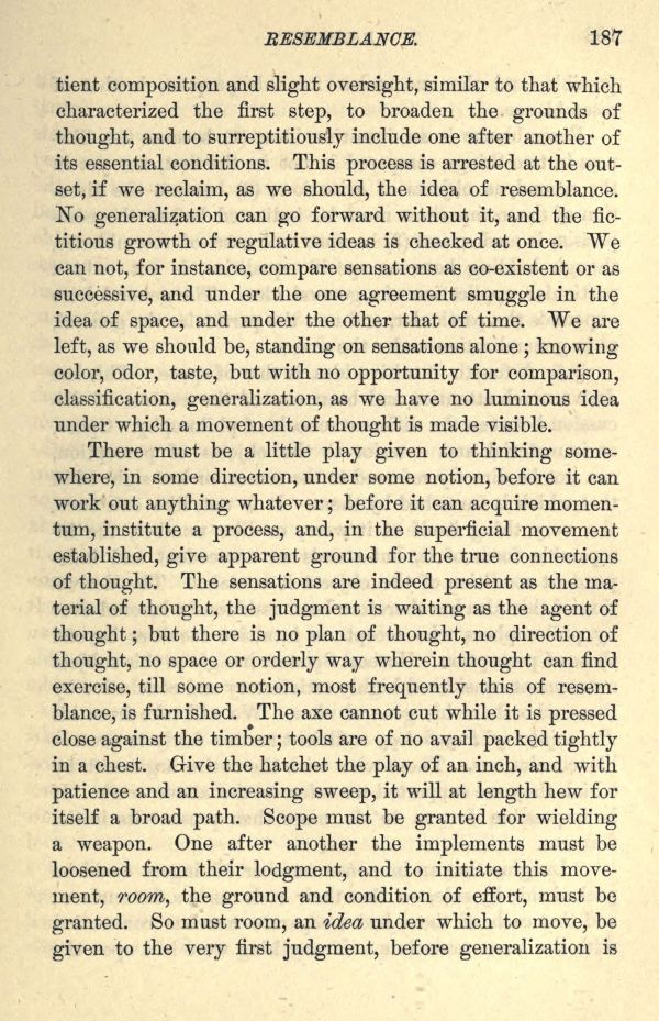 There must be a little play given to thinking somewhere, in some direction, under some notion, before it can work out anything whatever; before it can acquire momentum, institute a process, and, in the superficial movement established, give apparent ground for the true connections of thought. The sensations are indeed present as the material of thought, the judgment is waiting as the agent of thought; but there is no plan of thought, no direction of thought, no space or orderly way wherein thought can find exercise, till some notion, most frequently this of resemblance, is furnished. The axe cannot cut while it is pressed close against the timber; tools are of no avail packed tightly in a chest. Give the hatchet the play of an inch, and with patience and an increasing sweep, it will at length hew for itself a broad path. Scope must be granted for wielding a weapon. One after another the implements must be loosened from their lodgment, and to initiate this movement, room, the ground and condition of effort, must be granted. So must room, an idea under which to move, be given to the very first judgment, before generalization is