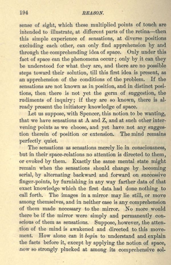 sense of sight, which these multiplied points of touch are intruded to illustrate, at different parts of the retina then this simple experience of sensations, at diverse positions excluding each other, can only find apprehension by and through the comprehending idea of space. Only under this fact of space can the phenomena occur; only by it can they be understood for what they are, and there are no possible steps toward their solution, till this first idea is present, as an apprehension of the conditions of the problem. If the sensations are not known as in position, and in distinct positions, then there is not yet the germ of suggestion, the rudiments of inquiry; if they are so known, there is already present the initiatory knowledge of space.
