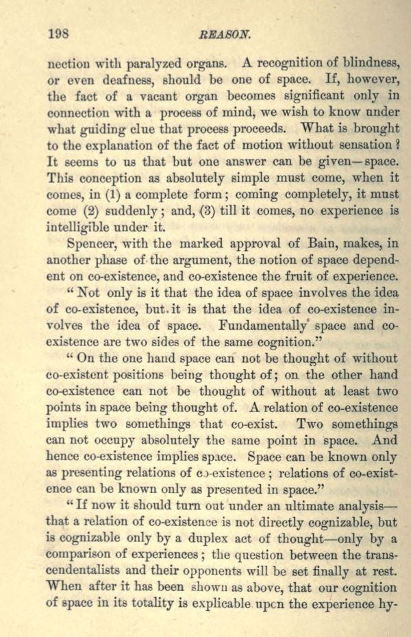 "If now it should turn out under an ultimate analysis that a relation of co-existence is not directly cognizable, but is cognizable only by a duplex act of thought only by a comparison of experiences; the question between the transcendentalists and their opponents will be set finally at rest. When after it has been shown as above, that our cognition of space in its totality is explicable upon the experience hypothesis,