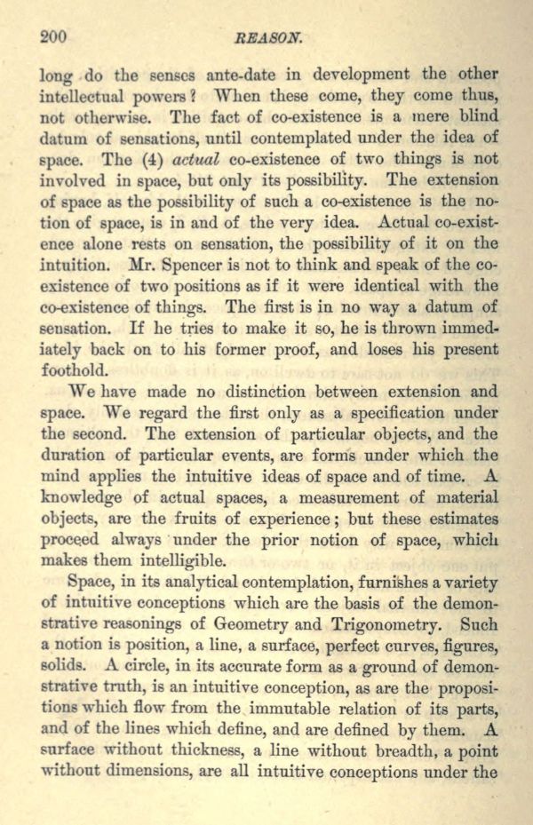 long do the senses ante-date in development the other intellectual powers? When these come, they come thus, not otherwise. The fact of co-existence is a mere blind datum of sensations, until contemplated under the idea of space. The (4) actual co-existence of two things is not involved in space, but only its possibility. The extension of space as the possibility of such a co-existence is the notion of space, is in and of the very idea. Actual co-existence alone rests on sensation, the possibility of it on the intuition. Mr. Spencer is not to think and speak of the coexistence of two positions as if it were identical with the co-existence of things. The first is in no way a datum of sensation. If he tries to make it so, he is thrown immediately back on to his former proof, and loses his present foothold.