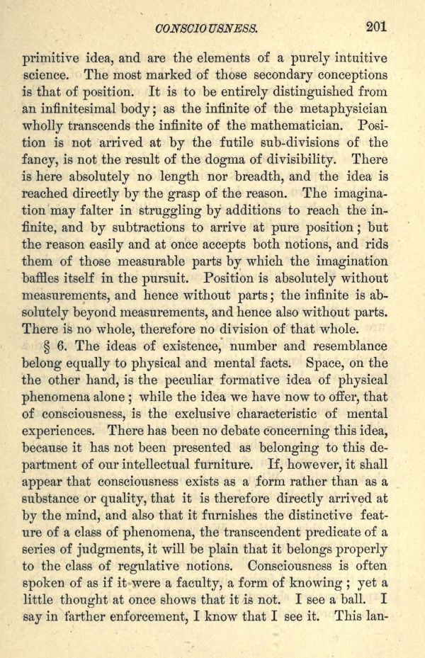 6. The ideas of existence, number and resemblance belong equally to physical and mental facts. Space, on the the other hand, is the peculiar formative idea of physical phenomena alone; while the idea we have now to offer, that of consciousness, is the exclusive characteristic of mental experiences. There has been no debate concerning this idea, because it has not been presented as belonging to this department of our intellectual furniture. If, however, it shall appear that consciousness exists as a form rather than as a substance or quality, that it is therefore directly arrived at by the mind, and also that it furnishes the distinctive feature of a class of phenomena, the transcendent predicate of a series of judgments, it will be plain that it belongs properly to the class of regulative notions. Consciousness is often spoken of as if it were a faculty, a form of knowing; yet a little thought at once shows that it is not. I see a ball. I say in farther enforcement, I know that I see it. This language