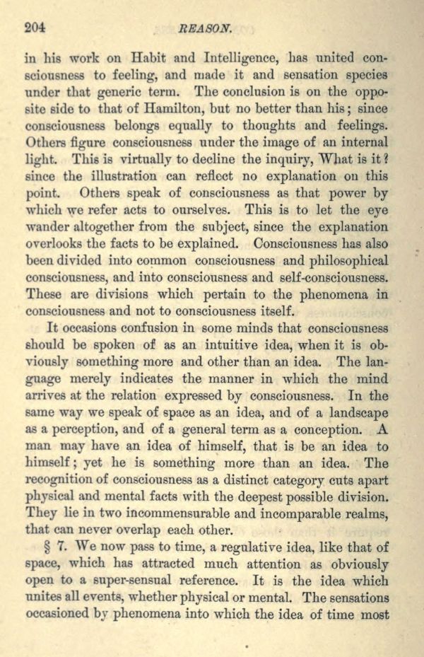 in his work on Habit and Intelligence, has united consciousness to feeling, and made it and sensation species under that generic term. The conclusion is on the opposite side to that of Hamilton, but no better than his; since consciousness belongs equally to thoughts and feelings. Others figure consciousness under the image of an internal light. This is virtually to decline the inquiry, What is it? since the illustration can reflect no explanation on this point. Others speak of consciousness as that power by which we refer acts to ourselves. This is to let the eye wander altogether from the subject, since the explanation overlooks the facts to be explained. Consciousness has also been divided into common consciousness and philosophical consciousness, and into consciousness and self-consciousness. These are divisions which pertain to the phenomena in consciousness and not to consciousness itself.