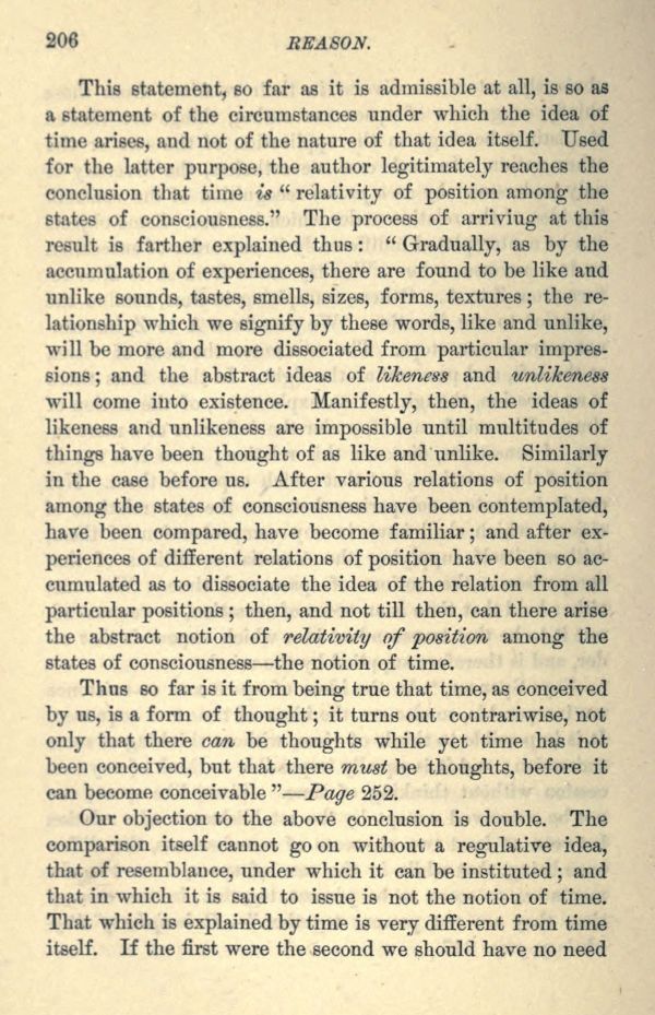 This statement, so far as it is admissible at all, is so as a statement of the circumstances under which the idea of time arises, and not of the nature of that idea itself. Used for the latter purpose, the author legitimately reaches the conclusion that time is "relativity of position among the states of consciousness." The process of arriving at this result is farther explained thus: "Gradually, as by the accumulation of experiences, there are found to be like and unlike sounds, tastes, smells, sizes, forms, textures; the relationship which we signify by these words, like and unlike, will be more and more dissociated from particular impressions; and the abstract ideas of likeness and unlikeness will come into existence. Manifestly, then, the ideas of likeness and unlikeness are impossible until multitudes of things have been thought of as like and unlike. Similarly in the case before us. After various relations of position among the states of consciousness have been contemplated, have been compared, have become familiar; and after experiences of different relations of position have been so accumulated as to dissociate the idea of the relation from all particular positions; then, and not till then, can there arise the abstract notion of relativity of position among the states of consciousness the notion of time.