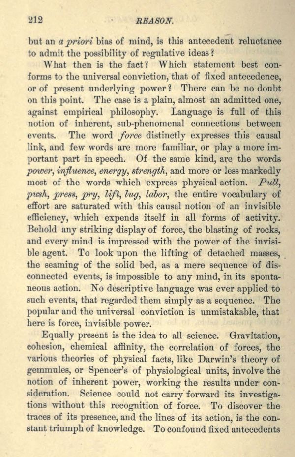 What then is the fact? Which statement best conforms to the universal conviction, that of fixed antecedence, or of present underlying power? There can be no doubt on this point. The case is a plain, almost an admitted one, against empirical philosophy. Language is full of this notion of inherent, sub-phenomenal connections between events. The word force distinctly expresses this causal link, and few words are more familiar, or play a more important part in speech. Of the same kind, are the words power, influence, energy, strength, and more or less markedly most of the words which express physical action. Pull, push, press, pry, lift, lug, labor, the entire vocabulary of effort are saturated with this causal notion of an invisible efficiency, which expends itself in all forms of activity. Behold any striking display of force, the blasting of rocks, and every mind is impressed with the power of the invisible agent. To look upon the lifting of detached masses, the seaming of the solid bed, as a mere sequence of disconnected events, is impossible to any mind, in its spontaneous action. No descriptive language was ever applied to such events, that regarded them simply as a sequence. The popular and the universal conviction is unmistakable, that here is force, invisible power.