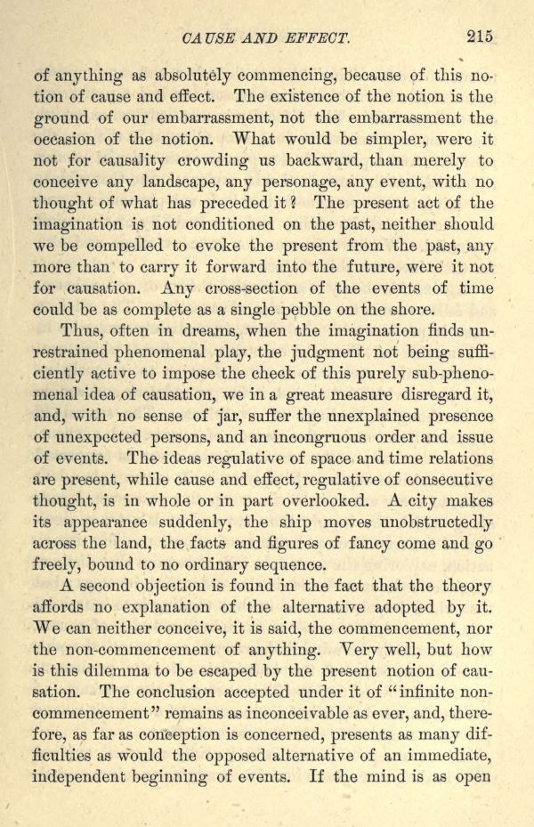 A second objection is found in the fact that the theory affords no explanation of the alternative adopted by it. We can neither conceive, it is said, the commencement, nor the non-commencement of anything. Very well, but how is this dilemma to be escaped by the present notion of causation. The conclusion accepted under it of " infinite noncommencement" remains as inconceivable as ever, and, therefore, as far as conception is concerned, presents as many difficulties as would the opposed alternative of an immediate, independent beginning of events. If the mind is as open
