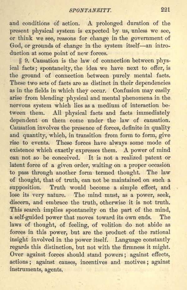 9. Causation is the law of connection between physical facts; spontaneity, the idea we have next to offer, is the ground of connection between purely mental facts. These two sets of facts are as distinct in their dependencies as in the fields in which they occur. Confusion may easily arise from blending physical and mental phenomena in the nervous system which lies as a medium of interaction between them. All physical facts and facts immediately dependent on them come under the law of causation. Causation involves the presence of forces, definite in quality and quantity, which, in transition from form to form, give rise to events. These forces have always some mode of existence which exactly expresses them. A power of mind can not so be conceived. It is not a realized patent or latent force of a given order, waiting on a proper occasion to pass through another form termed thought. The law of thought, that of truth, can not be maintained on such a supposition. Truth would become a simple effect, and lose its very nature. The mind must, as a power, seek, discern, and embrace the truth, otherwise it is not truth. This search implies spontaneity on the part of the mind, a self-guided power that moves toward its own ends. The laws of thought, of feeling, of volition do not abide as forces in this power, but are the product of the rational insight involved in the power itself. Language constantly regards this distinction, but not with the firmness it might. Over against forces should stand powers; against effects, actions; against causes, incentives and motives; against instruments, agents.