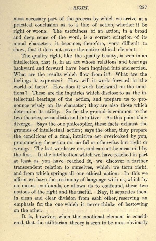 The quality right, like the quality beauty, is seen in an intellection, that is, in an act whose relations and bearings backward and forward have been inquired into and settled. What are the results which flow from it? What are the feelings it expresses? How will it work forward in the world of facts? How does it work backward on the emotions? These are the inquiries which disclose to us the intellectual bearings of the action, and prepare us to pronounce wisely on its character; they are also those which determine its utility. So far the ground is common to the two theories, sensualistic and intuitive. At this point they diverge. Says the one philosopher, these facts exhaust the grounds of intellectual action; says the other, they prepare the conditions of a final, intuitive act overlooked by you, pronouncing the action not useful or otherwise, but right or wrong. The last words are not, and can not be measured by the first. In the intellection which we have reached in part at least as you have reached it, we discover a farther transcendent relation to ourselves, which we term right, and from which springs all our ethical action. In this we affirm we have the testimony of language with us, which by no means confounds, or allows us to confound, these two notions of the right and the useful. Nay, it separates them in clean and clear division from each other, reserving an emphasis for the one which it never thinks of bestowing on the other.