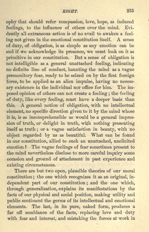 that should refer compassion, love, hope, as induced feelings, to the influence of others over the mind. Evidently all extraneous action is of no avail to awaken a feeling not given in the emotional constitution itself. A sense of duty, of obligation, is as simple as any emotion can be and if we acknowledge its presence, we must look on it as primitive in our constitution. But a sense of obligation is not intelligible as a general unattached feeling, indicating no definite line of conduct, haunting the mind as a vague premonitory fear, ready to be seized on by the first foreign force, to be applied as an alien impulse, having no necessary existence in the individual nor office for him. The imposed opinion of others can not create a feeling; the feeling of duty, like every feeling, must have a deeper basis than this. A general notion of obligation, with no intellectual element, no specific direction given to it by the mind whose it is, is as incomprehensible as would be a general impression of truth, or delight in truth, with nothing presenting itself as truth; or a vague satisfaction in beauty, with no object regarded by us as beautiful. What can be found in our constitution, allied to such an unattached, unelicited emotion? The vague feelings of fear sometimes present to the mind nevertheless disclose to more careful inquiry some occasion and ground of attachment in past experience and existing circumstances.