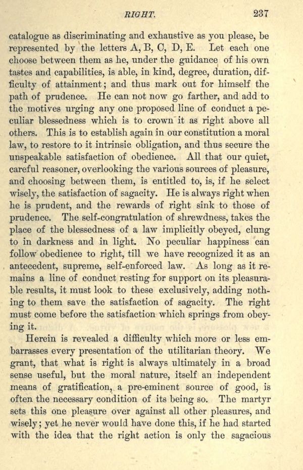 catalogue as discriminating and exhaustive as you please, be represented by the letters A, B, C, D, E. Let each one choose between them as he, under the guidance of his own tastes and capabilities, is able, in kind, degree, duration, difficulty of attainment; and thus mark out for himself the path of prudence. He can not now go farther, and add to the motives urging any one proposed line of conduct a peculiar blessedness which is to crown it as right above all others. This is to establish again in our constitution a moral law, to restore to it intrinsic obligation, and thus secure the unspeakable satisfaction of obedience. All that our quiet, careful reasoner, overlooking the various sources of pleasure, and choosing between them, is entitled to, is, if he select wisely, the satisfaction of sagacity. He is always right when he is prudent, and the rewards of right sink to those of prudence. The self-congratulation of shrewdness, takes the place of the blessedness of a law implicitly obeyed, clung to in darkness and in light. No peculiar happiness can follow obedience to right, till we have recognized it as an antecedent, supreme, self-enforced law. As long as it remains a line of conduct resting for support on its pleasurable results, it must look to these exclusively, adding nothing to them save the satisfaction of sagacity. The right must come before the satisfaction which springs from obeying it.