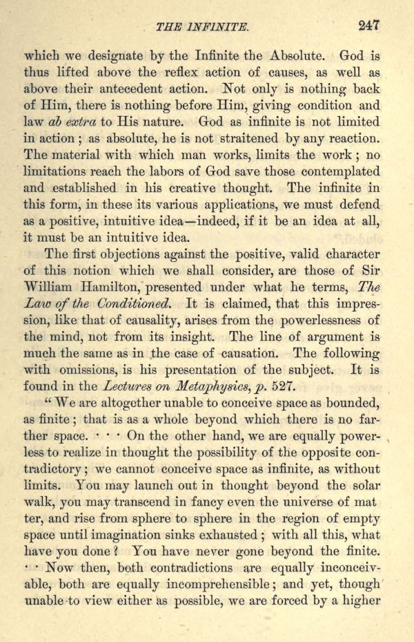 which we designate by the Infinite the Absolute. God is thus lifted above the reflex action of causes, as well as above their antecedent action. Not only is nothing back of Him, there is nothing before Him, giving condition and law ab extra to His nature. God as infinite is not limited in action; as absolute, he is not straitened by any reaction. The material with which man works, limits the work; no limitations reach the labors of God save those contemplated and established in his creative thought. The infinite in this form, in these its various applications, we must defend as a positive, intuitive idea indeed, if it be an idea at all, it must be an intuitive idea.