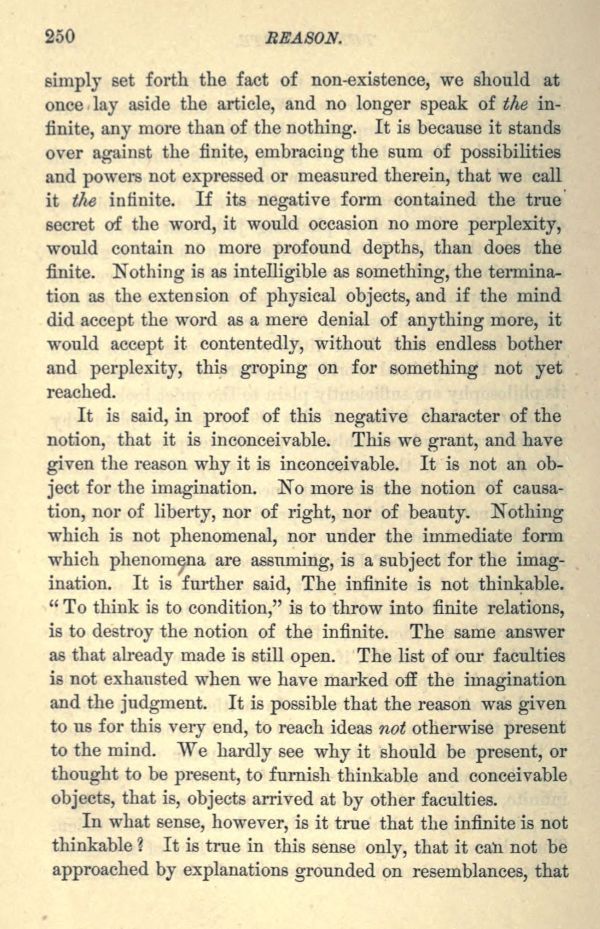 It is said, in proof of this negative character of the notion, that it is inconceivable. This we grant, and have given the reason why it is inconceivable. It is not an object for the imagination. No more is the notion of causation, nor of liberty, nor of right, nor of beauty. Nothing which is not phenomenal, nor under the immediate form which phenomena are assuming, is a subject for the imagination. It is further said, The infinite is not thinkable. " To think is to condition," is to throw into finite relations, is to destroy the notion of the infinite. The same answer as that already made is still open. The list of our faculties is not exhausted when we have marked off the imagination and the judgment. It is possible that the reason was given to us for this very end, to reach ideas not otherwise present to the mind. We hardly see why it should be present, or thought to be present, to furnish thinkable and conceivable objects, that is, objects arrived at by other faculties.