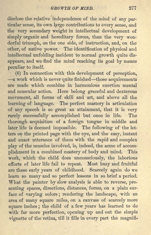 (6) In connection with this development of perception, a work which is never quite finished those acquirements are made which combine in harmonious exertion mental and muscular action. Here belong graceful and dexterous movement, all forms of skill and art, and above all the learning of language. The perfect mastery in articulation of any speech is so great an attainment, that it is very rarely successfully accomplished but once in life. The thorough acquisition of a foreign tongue in middle and later life is deemed impossible. The following of the letters on the printed page with the eye, and the easy, instant and exact utterance of them with the rapid and complex play of the muscles involved, is, indeed, the acme of accomplishment in a combined mastery of body and mind. This work, which the child does unconsciously, the laborious efforts of later life fail to repeat. Most busy and fruitful are these early years of childhood. Scarcely again do we learn so many and so perfect lessons in so brief a period. What the painter by slow analysis is able to reverse, presenting spaces, directions, distances, forms, on a plain surface of varying colors; rendering the landscape, with an area of many square miles, on a canvass of scarcely more square inches; the child of a few years has learned to do with far more perfection, opening up and out the simple vignette of the retina, till it fills in every part the magnificent