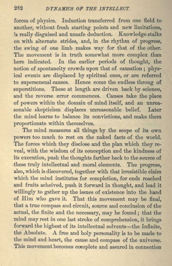 The mind measures all things by the scope of its own powers too much to rest on the naked facts of the world. The forces which they disclose and the plan which they reveal, with the wisdom of its conception and the kindness of its execution, push the thoughts farther back to the source of these truly intellectual and moral elements. The progress, also, which is discovered, together with that irresistible claim which the mind institutes for completion, for ends reached and fruits achieved, push it forward in thought, and lead it willingly to gather up the issues of existence into the hand of Him who gave it. That this movement may be final, that a true compass and circuit, source and conclusion of the actual, the finite and the necessary, may be found; that the mind may rest in one last stroke of comprehension, it brings forward the highest of its intellectual solvents the Infinite, the Absolute. A free and holy personality is to be made to the mind and heart, the cause and compass of the universe. This movement becomes complete and assured in connection