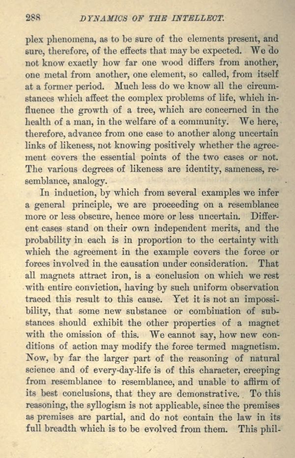 In induction, by which from several examples we infer a general principle, we are proceeding on a resemblance more or less obscure, hence more or less uncertain. Different cases stand on their own independent merits, and the probability in each is in proportion to the certainty with which the agreement in the example covers the force or forces involved in the causation under consideration. That all magnets attract iron, is a conclusion on which we rest with entire conviction, having by such uniform observation traced this result to this cause. Yet it is not an impossibility, that some new substance or combination of substances should exhibit the other properties of a magnet with the omission of this. We cannot say, how new conditions of action may modify the force termed magnetism.