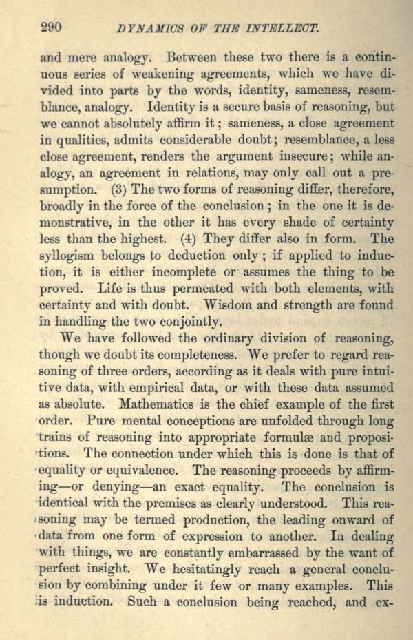and mere analogy. Between these two there is a continuous series of weakening agreements, which we have divided into parts by the words, identity, sameness, resemblance, analogy. Identity is a secure basis of reasoning, but we cannot absolutely affirm it; sameness, a close agreement in qualities, admits considerable doubt; resemblance, a less close agreement, renders the argument insecure; while analogy, an agreement in relations, may only call out a presumption. (3) The two forms of reasoning differ, therefore, broadly in the force of the conclusion; in the one it is demonstrative, in the other it has every shade of certainty less than the highest. (4) They differ also in form. The syllogism belongs to deduction only; if applied to induction, it is either incomplete or assumes the thing to be proved. Life is thus permeated with both elements, with certainty and with doubt. Wisdom and strength are found in handling the two conjointly.