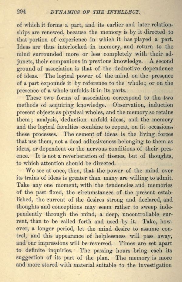 These two forms of association correspond to the two methods of acquiring knowledge. Observation, induction present objects as physical wholes, and the memory so retains them; analysis, deduction unfold ideas, and the memory and the logical faculties combine to repeat, on fit occasions) these processes. The cement of ideas is the living forces that use them, not a dead adhesiveness belonging to them as ideas, or dependent on the nervous conditions of their presence. It is not a reverberation of tissues, but of thoughts, to which attention should be directed.