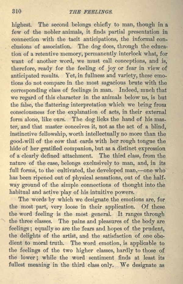 highest. The second belongs chiefly to man, though in a few of the nobler animals, it finds partial presentation in connection with the tacit anticipations, the informal conclusions of association. The dog does, through the education of a retentive memory, permanently interlock what, for want of another word, we must call conceptions, and is, therefore, ready for the feeling of joy or fear in view of anticipated results. Yet, in fullness and variety, these emotions do not compare in the most sagacious brute with the corresponding class of feelings in man. Indeed, much that we regard of this character in the animals below us, is but the false, the flattering interpretation which we bring from consciousness for the explanation of acts, in their external form alone, like ours. The dog licks the hand of his master, and that master conceives it, not as the act of a blind, instinctive fellowship, worth intellectually no more than the good-will of the cow that cards with her rough tongue the hide of her gratified companion, but as a distinct expression of a clearly defined attachment. The third class, from the nature of the case, belongs exclusively to man, and, in its full forms, to the cultivated, the developed man, one who has been ripened out of physical sensations, out of the halfway ground of the simple connections of thought into the habitual and active play of his intuitive powers.