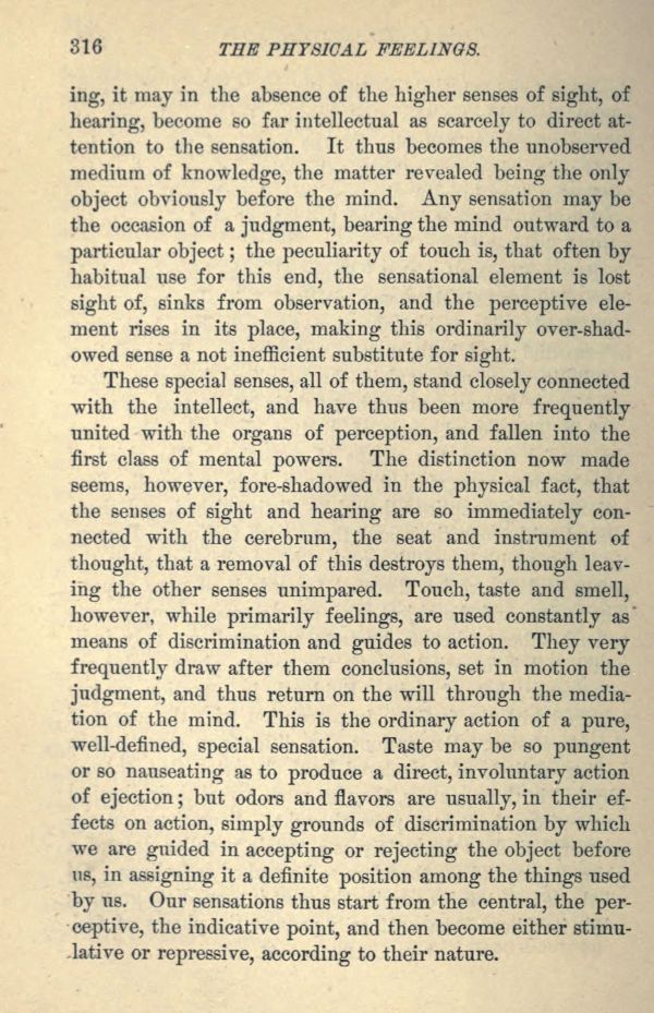 These special senses, all of them, stand closely connected with the intellect, and have thus been more frequently united with the organs of perception, and fallen into the first class of mental powers. The distinction now made seems, however, fore-shadowed in the physical fact, that the senses of sight and hearing are so immediately connected with the cerebrum, the seat and instrument of thought, that a removal of this destroys them, though leaving the other senses unimpaired. Touch, taste and smell, however, while primarily feelings, are used constantly as means of discrimination and guides to action. They very frequently draw after them conclusions, set in motion the judgment, and thus return on the will through the mediation of the mind. This is the ordinary action of a pure, well-defined, special sensation. Taste may be so pungent or so nauseating as to produce a direct, involuntary action of ejection; but odors and flavors are usually, in their effects on action, simply grounds of discrimination by which we are guided in accepting or rejecting the object before us, in assigning it a definite position among the things used by us. Our sensations thus start from the central, the perceptive, the indicative point, and then become either stimulative or repressive, according to their nature.