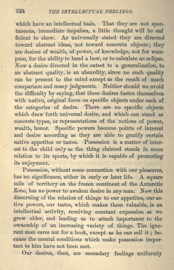Possession, without some connection with our pleasures, has no significance, either in early or later life. A square mile of territory on the frozen continent of the Antarctic Zone, has no power to awaken desire in any man. Now this discerning of the relation of things to our appetites, our active powers, our tastes, which makes them valuable, is an intellectual activity, receiving constant expansion as we grow older, and leading us to attach importance to the ownership of an increasing variety of things. The ignorant man cares not for a book, except as he can sell it; because the mental conditions which make possession important to him have not been met.